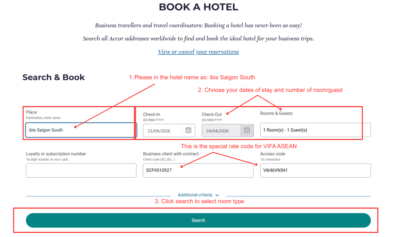 Note: Type the correct name of the Hotel (Ibis Saigon South) to get for a special rate code.